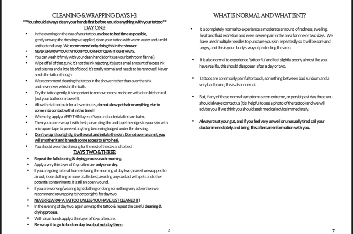 WE OFFER A FULL AFTERCARE PACK AND AFTERCARE BARRIER CREAM BY YAYO AT THE STUDIO AS WELL AS A QUICK HEALING GUIDE IF YOU JUST NEED YOUR MEMORY REFRESHED. Please feel free to ask about these when you are getting your tattoo.